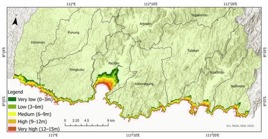 The coastal regions of Pacitan Regency exhibit a significant tsunami hazard (Figure 7 and Figure 8). The modelling results indicate that regions can be classified based on the hazard level into the very low category (0–3 m), encompassing 11,698 km2, the low category (3–6 m) covers 10,995 km2, the medium category (6–9 m) spans 10,792 km2, the high category (9–12 m) includes 10,954 km2, and the very high category (>12 m) accounts for 10,716 km2. The distribution indicates that the majority of hazard zones encounter moderate to very high danger levels, suggesting a likelihood of considerable damage to infrastructure and settlements in the coastal districts of Pacitan.