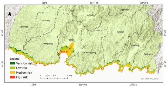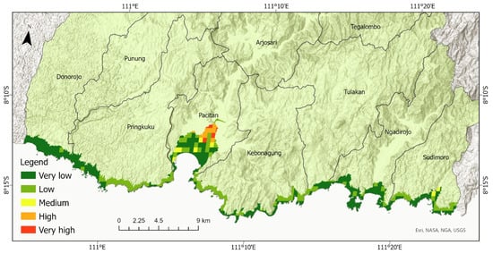 The vulnerability analysis in the coastal Pacitan district indicates that most places have a very low level of vulnerability (Figure 9 and Figure 10). The extremely low vulnerability group encompasses 32.04 km2 of the overall area. Simultaneously, the low vulnerability group encompasses 18.86 km2.