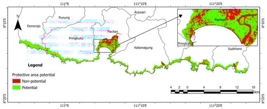 Figure 13 illustrates potential zones for the establishment of protective bio-shield areas against tsunamis. The discovery that 74% of Pacitan’s coastal regions are appropriate for the planning of protective bio-shields highlights the considerable potential for nature-based strategies in tsunami mitigation. Incorporating bio-shields, such as mangroves and coastal forests, is essential for diminishing wave energy and mitigating tsunami effects. Research from the Middle East indicates that dense forests, such as date palm plantations, can decrease wave velocity and depth by as much as 40% in areas susceptible to tsunamis [73]. The 26% of non-potential areas highlight challenges, including deforestation, urbanisation, and land-use pressures that require attention through spatial planning and restoration initiatives [73,74]. Strategic reforestation and customised bio-shield designs can convert these areas into efficient protective zones while fostering sustainable development. Collaboration among policymakers, local communities, and environmental organisations will be essential in effectively utilising high-potential areas to mitigate tsunami risks.