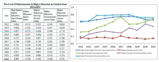 From 2012 to 2021, the level of higher education modernization in Guizhou has shown steady improvement. According to Zou Lianke (2023), education in Guizhou Province is currently undergoing a phase of catching up. The Guizhou government’s “Six Major Enhancements” strategy, which includes substantial improvements in poverty alleviation and five other closely related educational strategies, has been pivotal.