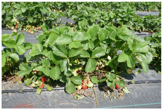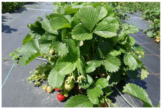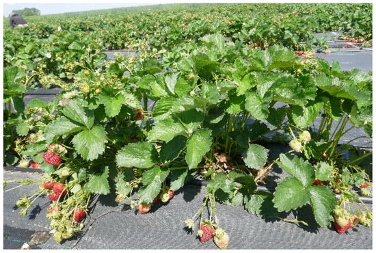 The experimental factors of the experiments were as follows: (1) the recently developed K2–K6 preparations and (2) three strawberry varieties (‘Honeoye’ (Figure 1), ‘Rumba’ (Figure 2), and ‘Vibrant’ (Figure 3)). These are early varieties recommended for organic cultivation. ‘Rumba’ shows fairly good resistance to leathery rot and verticilliosis, as well as the powdery mildew of strawberries. It is considered one of the most popular early varieties due to its high resistance to most diseases, frost resistance, as well as good fruit quality and flavour. [38]. ‘Vibrant’ is a dessert variety with large fruits. It is valued for its flavour, high yielding potential, and long post-harvest shelf life. The variety is moderately resistant to powdery mildew, leathery fruit rot, and strawberry crown rot. An additional advantage is easy and fast harvesting due to the plant height and large fruits [39]. ‘Honeoye’ is a variety showing good resistance to grey mould and leaf diseases, but it is quite sensitive to verticilliosis and has low frost resistance. It is prized for its juicy and very sweet fruits, which are recommended for processing [40]. The plantation under investigation was not irrigated.