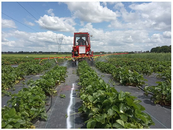 The formulations were applied three times throughout the growing season via a Fragaria boom sprayer (Figure 4). The dose per treatment was 50 kg·ha−1 of formulation, dissolved in 700 L of water. The formulation used was a prototype; the target formulations for the market are 10 times more concentrated. The results presented herein are for the 2021 and 2022 harvest seasons, which represent the second and third years of plantation fruiting, respectively. The strawberry fruits were harvested at intervals of 2–3 days. Chemical analyses were conducted on the fruit harvested on 14 June 2021 and 13 June 2022. The fruits were harvested from the same eight plants on each harvest date. Following harvesting, the fruits were frozen and then freeze-dried (lyophilised). The chemical analysis with an ICP-MS spectrometer (for metal content analysis) and a TOC/TN analyser (vario Macro cube CN elementary analyser (Elementar Analysensysteme GmbH; Langenselbold, Germany)) (for carbon and nitrogen content analysis) was used. The analysis of metal concentration was conducted using inductively coupled plasma mass spectrometry (Agilent quadrupole 7500CE ICP-MS; Santa Clara, CA, USA). The extracts were prepared in concentrated nitric acid by microwave digestion. A blank sample and certified reference material (NIST1400 and CRM028-050) were included in the analyses for quality control of the entire analytical process. The basic validation of the parameters included the recognition of recovery, ranging from 90 to 97% for the analysed metals, and precision, defined as a relative standard deviation < 3%. The limit of detection (LOD) ranged from 0.007 mg/kg to 0.099 mg/kg.
