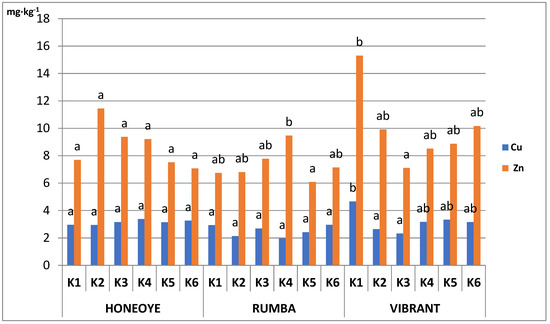 The highest manganese content of 41.8 mg·kg−1 was found for ‘Vibrant’, 24.4% higher than ‘Rumba’ (33.6 mg·kg−1). Significantly, the lowest manganese content was found for the ‘Honeoye’ cultivar (29.2 mg·kg−1) (Table 7). The manganese content of the fruit ranged from 24.6 mg·kg−1 (preparation K5 cultivar ‘Rumba’) to 45.3 mg·kg−1 (preparation K6 cultivar ‘Vibrant’). On average, lower fruit manganese contents (29.0 mg·kg−1) were recorded for all cultivars after application of the K5 combination compared to those for strawberries from sites where K2 (37.5 mg·kg−1), K4 (37.1 mg·kg−1), and K6 (36.2 mg·kg−1) were applied. Hattab et al. [50] found the manganese content at a level of 0.387 μg·g−1, while in the present study the manganese content ranged from 26.3 mg·kg−1 for ‘Honeoye’ fruits treated with K5 to 45.3 mg·kg−1 for ‘Vibrant’ fruits treated with the K6 biopreparation. Moreover, in a study conducted by Hattab et al. [50], the content of selected microelements and heavy metals (Fe, Mg, Mn, K, Ca, Na, Zn, Cu, Ni, Cd) in ‘Sabrina’ strawberry fruits cultivated under organic and conventional farming systems were analysed, and the results demonstrated significantly higher concentrations of micronutrients in organically cultivated fruits in comparison to in their conventionally grown counterparts. In the case of heavy metals Cd, Cu, and Zn, no significant differences were identified in the content of these elements between organic and conventional fruits. A significantly higher concentration of copper was observed in conventional fruits (0.62 μg·g−1 dry weight) compared to in organic fruits (0.48 μg·g−1 dry weight) [50]. In the present study, the mean copper content in organic strawberries was 2.57 mg·kg−1 for the K2 treated object and 3.52 mg·kg−1 for the control (K1).