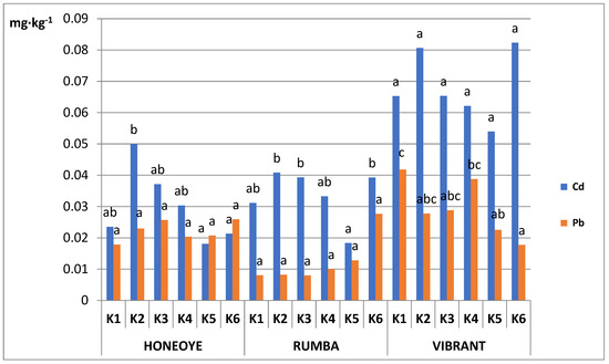 As in the case of cadmium, there were no exceedances of the permissible amounts of lead (0.10 mg·kg−1 fruit) in strawberry fruit for any of the combinations tested (Commission Regulation (EU) 2023/915 of 25 April 2023 [53] (Figure 6). As in the case of cadmium, fruit of the Rumba cultivar had a lower lead content (0.013 mg·kg−1) than that of fruit of the ‘Vibrant’ cultivar (0.029 mg·kg−1). In the control treatment K1 of the ‘Vibrant’ cultivar, fruits were characterised by a significantly higher lead content (0.42 mg·kg−1) compared to that of treatments sprayed with the biopreparation K6 (0.018 mg·kg−1) and K5 (0.023 mg·kg−1).