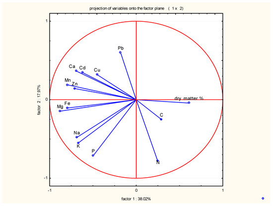 Ordination diagram of dry matter and element content in strawberry fruits in relation to first and second axes of PCA.