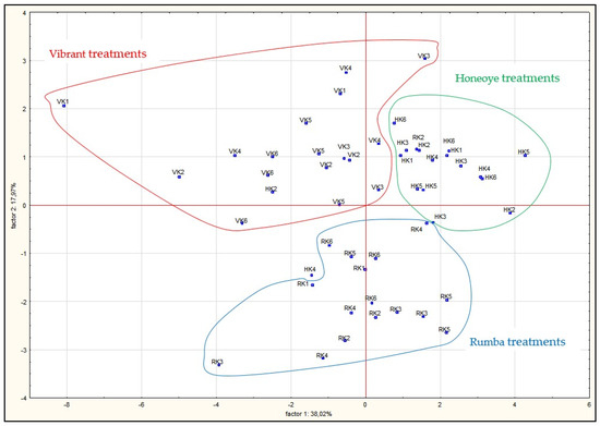 Ordination diagram of objects (varieties and biopreparation treatments) in relation to first and second axes of PCA (n = 3).
