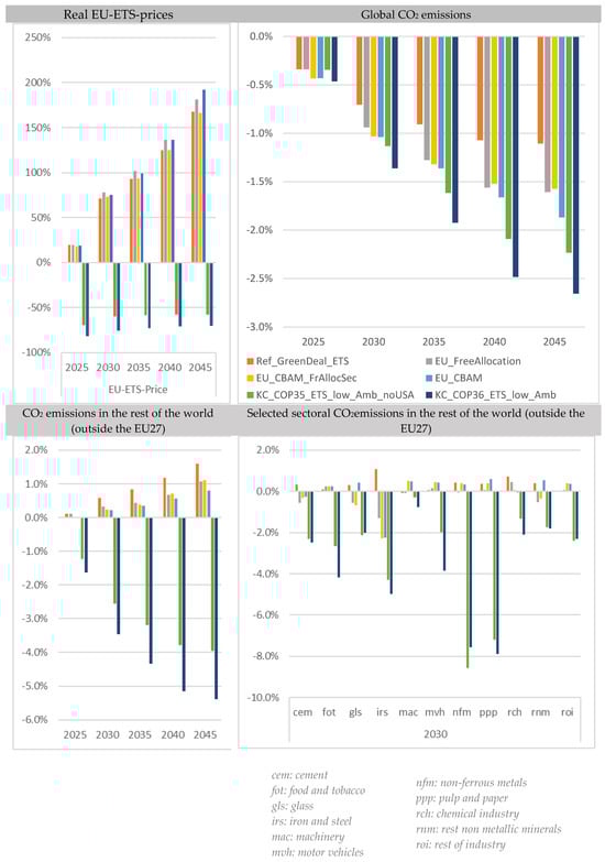 As Figure 1 and in particular the comparison of the two reference scenarios “Ref_noGreenDeal_ETS” and “Ref_GreenDeal_ETS” show, the intensification of climate protection targets in the form of the introduction of the EU Green Deal tends to result in significant CO2 price-increasing effects within the EU (>+165% in 2045). As a result of this development and thus the increase in the price of CO2 emissions within the EU, global CO2 emissions in the aggregate fall (<−1% in 2045). However, as Figure 1 also shows, CO2 emissions in the rest of the world will increase if European CO2 emission allowances become more expensive. This indicates that CO2 emissions caused under less stringent conditions within the EU27 are partly outsourced to other countries with continued favorable framework conditions as a result of the increase in prices due to the Green Deal. Carbon leakage is the result. Energy-intensive sectors in particular (such as steel, chemicals, or cement) are relocating their production to non-European countries.