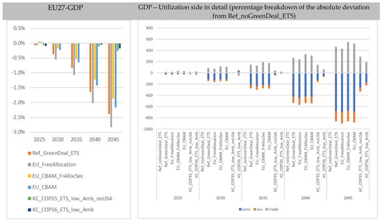 Figure 2 clearly shows that climate action under the Green Deal is associated with macroeconomic costs for the EU27. Compared to the reference, i.e., “Stated Policies” targets for the EU27, the scenario with the implemented Green Deal shows a weakening of GDP development within the EU27. The stricter greenhouse gas emission targets lead to GDP losses of around −1% in the affected countries in the aggregate compared to the reference (“Ref_noGreenDeal_ETS”). At the same time, however, gross domestic product outside the EU27 also falls in the aggregate here. An increase in the price of European exports (particularly in the crude oil (CRU), service (SER), machinery (MAC), and rest of industry (ROI) sectors) appears to be having an impact.