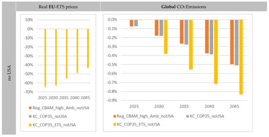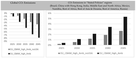In order to prevent this effect to the greatest possible extent, various CL measures and their protective effect are now examined. As described above, the two scenarios “EU_CBAM_high_Amb_noUSA” and “EU_CBAM_high_Amb” are used below as a new comparison case for the further analyses. As in the first stage of the analysis, we start by examining the effects on CO2 emissions.