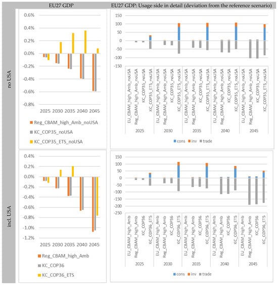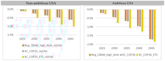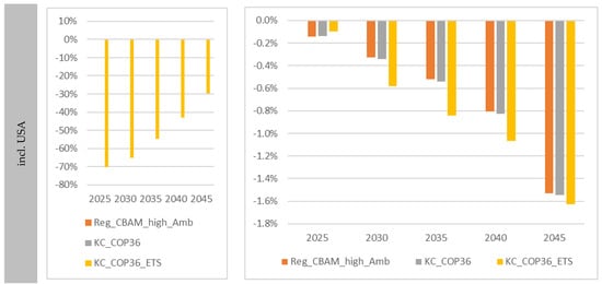 The analysis of the economic effects illustrated in Figure 6 shows that regional individual CBAM protection of potential climate club member regions outside the EU27 (“Reg_CBAM_high_Amb_noUSA” and “Reg_CBAM_high_Amb”) tends to have a negative impact on the Union’s GDP (up to approx. −0.6% or −1% in 2045), which is expressed as an increasing loss in the balance of trade (exports lose profitability due to taxation). With regard to the CO2 emission effects, a merger (of all ambitious regions) in the climate club and the joint levying of a border tax (without a joint emissions trading system; “KC_COP36_noUSA” and “KC_COP36”) result in similar EU27 GDP changes. In both scenarios, the other ambitious countries (outside the EU27) in the aggregate tend to benefit from their CL protection compared to the reference. These positive effects are somewhat more pronounced with the participation of the USA, but are not significant (≤+1%). The rest of the world tends to show negative GDP trends in the two CBAM variants considered here (without a joint ETS system), although these remain negligible (<−0.4%) until 2045. Overall, this also results in negligible negative macroeconomic effects at the global level up to approx. −0.1% in 2045.