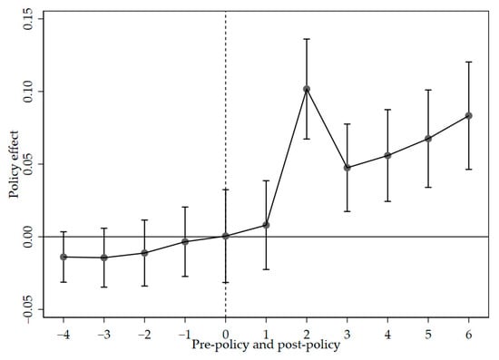 The key premise of the gradual difference-in-differences model is the parallel trends assumption, which states that before the policy implementation, the trends in the digital transformation of enterprises in demonstration cities and non-demonstration cities are assumed to be parallel. Due to limited data for the four years prior to and the six years following policy implementation, this study aggregates the data from the four years before policy implementation into period 4 and the data from the six years after into period 6. The results of the parallel trends test shown in Figure 2 indicate that the coefficient estimates for each period before the implementation of the “Broadband China” policy are not significant. This indicates that prior to the policy implementation, there were no significant differences in the digital transformation levels of enterprises between demonstration and non-demonstration cities, and the study sample passes the parallel trends test. This result further validates the positive impact of digital transformation on export technological complexity, confirming that the effect is not influenced by unobserved factors.