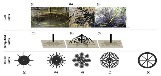 We designed mangrove mimics with 3D-printed roots for five root mass distributions (Figure 1 and Figure 2b) and various root breakages (Figure 2b). The root mass distributions were inspired by photos of uprooted or eroded mangrove roots of Avicennia germinans, Avicennia alba, and Rhizophora stylosa (shown in Figure 1a–c).