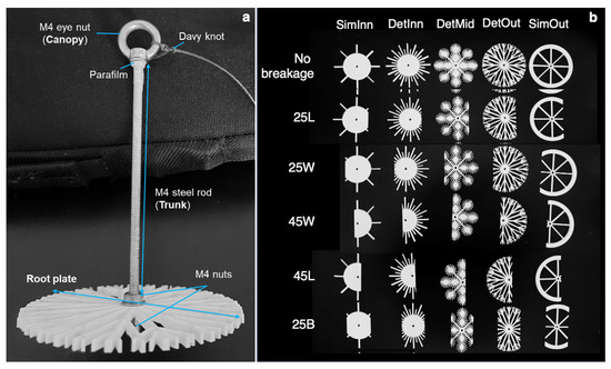 (a) Construction of a mangrove mimic, with a tree trunk made of a M4 stainless steel rod, a canopy made of a M4 stainless steel eye nut held firmly in place with parafilm, and a 3D-printed root plate held in place with nuts. The mimic and root plates are shown following the pulling direction used in the pulling tests. (b) The 3D-printed root plates, showing the five root mass distributions (where Sim = simple and Det = detailed), including breakage variations; no breakage, 25% or 45% root plate area loss, windward breakage (25WL, 25W), leeward breakage (25L, 45L), or breakage at both sides (25B).