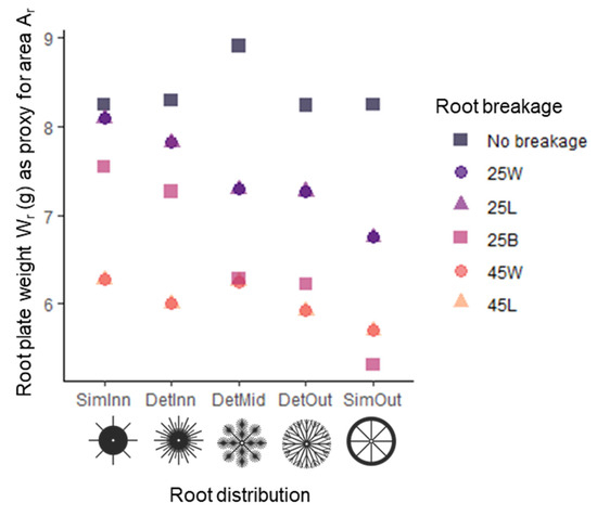 Root plate weight Wr (g), as a proxy for area Ar (cm2), per root mass distribution and root breakage.