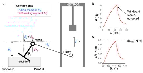 The pulling experiment, with (a) the pulling setup (not to scale) used to measure the overturning moment of each mimic using an INSTRON universal testing machine (INSTRON, Norwoord, MA, USA), (b) an example of the output of a pulling test with load F (N) per extension ε (mm), which illustrates how the load (F) drops after the windward side is uprooted, and (c) an illustration of how we obtained the maximum overturning moment Mtmax (N∙m). The calculation of the overturning moment Mt (N∙m) is described in the text.