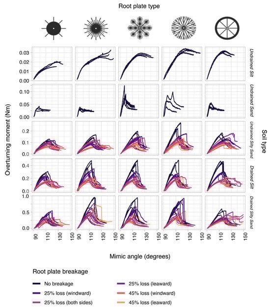 The overturning curves varied between sediment types, root mass distributions and root breakage (Figure 5). The maximum overturning moment withstood by the soil–root system (proxy of tree stability) was largest for drained soils with a low water content and a relatively larger sediment size. This can be seen in the larger stability values for Drained Silty Sand compared to the smaller values for Undrained Silts in Figure 5. The relationship between tree stability and the sediment type has been explicitly illustrated in Figure 6, which shows how the maximum overturning moment increases with the sediment shear strength.