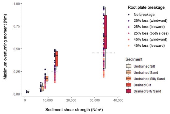 Effect of sediment type on mimic stability, showing maximum overturning moment (N m) per sediment shear strength (N m−2), shown for all root mass distributions and breakages. Points show all data and are shown at the exact mean shear strength, while the boxplots are dodged. The boxplots only show data for the non-broken root systems, as Undrained Silt and Undrained Sand were not tested with broken roots. The dashed line indicates the standard deviation of the shear strength measurements. Breakages were half (25% of the complete plate) or complete (45%) breakage at the windward, leeward, or both sides of the root plate (see Figure 2b).
