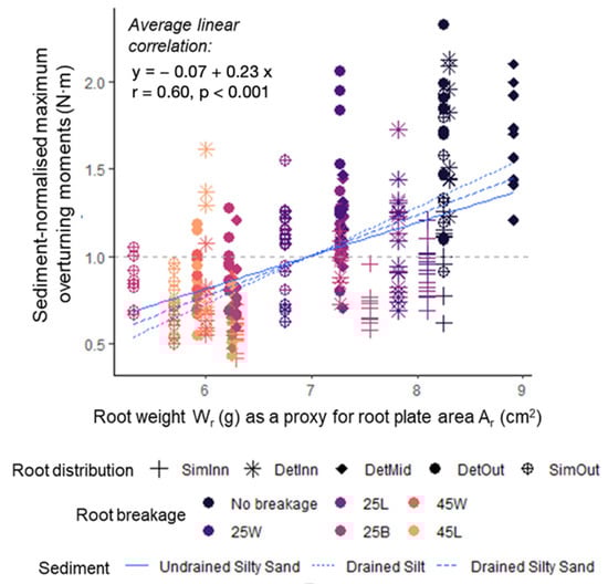 Effect of root breakage on mimic stability, with sediment-normalized maximum overturning moment Mtmax (N·m) per root weight Wr (g) as a proxy for surface area Ar (cm2), tested in Undrained Silt Sand, Drained Silt and Drained Silty Sand. Blue lines indicate the Pearson correlation between the root weight Wr and the sediment-adjusted maximum overturning moment Mtmax.