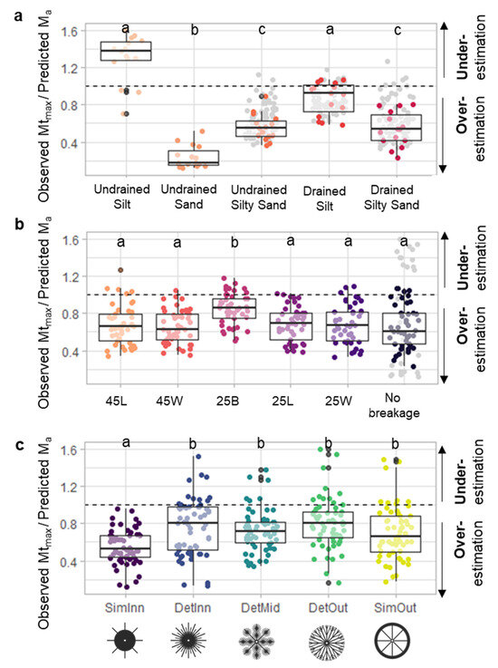 Jitterplots and boxplots of model fit for (a) sediment types, (b) root breakage and (c) root distributions. Colored dots represent the data used in the boxplots. Grey dots represent the entire dataset but are excluded as not all root breakages were tested in all sediments. The dashed lines indicate an accurate prediction. The significance letters for boxplots (α = 0.05) were obtained according to Dunn’s test. Breakages were half (25% of the complete plate) or complete (45%) breakage at the windward, leeward, or both sides of the root plate (see Figure 2b).