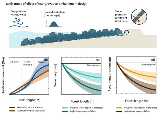 The wave heights propagating through damaged forests can then inform the design of coastal protection structures, such as revetments for embankments. As illustrated in Figure 9, neglecting mangrove failure due to wind and waves in design calculations risks underestimating the structural requirements, potentially compromising the flood safety of the hinterland.