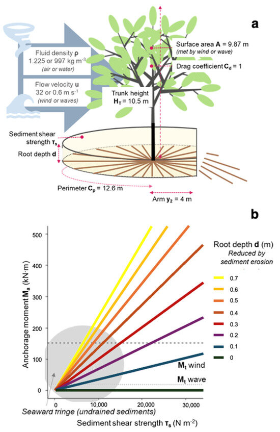 Once validated with field data, these failure models could predict tree instability during storms using Equations (4)–(6) and various forest data, including the species distribution, height, surface area, root dimensions, and local sediment characteristics. These equations can complement existing wave reduction models, such as those by Mendez and Losada [48], by accounting for vegetation failure and its impact on wave attenuation. Similarly, mangrove failure formulations could be applied using the output of wind models.
