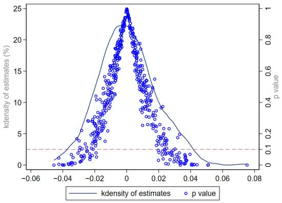 Individual placebo test results. Note: The horizontal axis in the figure represents the scale for the estimated coefficient values, the left vertical axis corresponds to the scale for the kernel density estimates, and the right vertical axis indicates the range of p-values. The distribution of coefficient values in the figure approximates a normal distribution, centered around the zero axis. Notably, the coefficient value of 0.1034 lies towards the right tail of the distribution curve, exceeding the range covered by the figure.