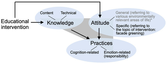 ESD should, therefore, have a special status in school lessons. It is thus necessary to consider which traditional curriculum-relevant topics can be summarized under an environmental context and taught with a new focus. Such a new focus could be provided by referring to green facades, because this context allows teachers to address various SDGs, particularly 3, 11, 13, and 15 (see Section 2.1.1). However, such a new context, which often originates in research, seldom finds its way directly into school lessons, but rather via the “detour” of extracurricular learning venues and activities. The latter usually offer courses of limited duration, e.g., half a day or one day. This raises the question of the impact of these short-term offers, whereby longer-term effects are desired. Ideally, these effects should relate to all components of the KAP triad, i.e., students’ knowledge (K), attitude (A), and practices/behavior (P) in the context of interest. Our study therefore focuses on the longer-term effects on the KAP triad caused by an extracurricular project day on green facades for students aged around 14 at a German university. In other words, the aim of the study is to evaluate the effects of a short-term intervention about green facades on knowledge and attitude and to investigate their relation to relevant practices.
