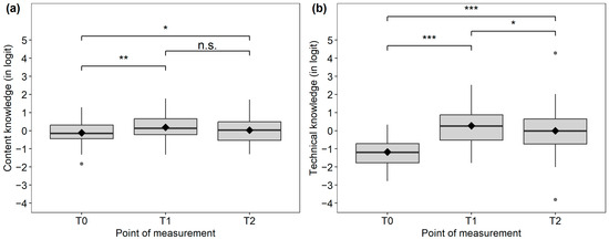 Figure 3. Content knowledge over time (a), technical knowledge over time (b). n = 62. Box plots including mean (◆). Removing outliers (gray dots) did not change the main result of a knowledge increase through the didactic intervention. n.s. = not significant, * p < 0.05, ** p < 0.01, *** p < 0.001.