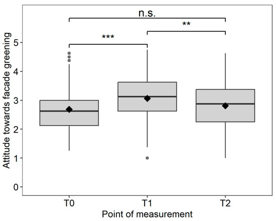 Figure 4. Attitude towards the green facades over time. n = 71. Box plots including mean (◆). Removing outliers (gray dots) did not change the results. n.s. = not significant, ** p < 0.01, *** p < 0.001.