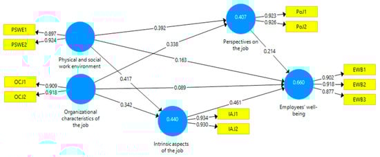 Cronbach’s Alpha coefficients for employees’ well-being (0.881), intrinsic aspects of the job (0.849), organizational characteristics of the workplace (0.802), perspectives on the job (0.83), and the physical and social work environment (0.796) all exceeded the minimum threshold of 0.7, signaling that the items associated with each variable consistently measured the corresponding construct. The T Statistics values (>1.6) and p values (<0.05) indicated that these Cronbach’s Alpha values were statistically significant. The AVE values ranged between 0.809 and 0.869, meaning the latent variables captured a high proportion of the variance in their items. These values emphasized the model’s quality and the accurate measurement of the theoretical constructs.