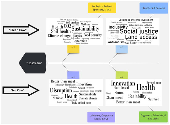 I begin by reviewing the word clouds generated from the earlier exercise. Figure 3 illustrates these images; each word’s size reflects its frequency of mention. Those associated with so-called “clean cow” networks appear above the line, indicated on the left by the term “upstream”, while those representing “no cow” actors fall below it. Terms are further categorized according to the roles outlined in Table 4. Those unfamiliar with the downstream/upstream terminology refer to the two ends of a value chain [58].