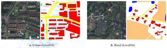 Diverse geographical landscape on the LoveDA dataset. (a) Image and label in urban areas; (b) image and label in rural areas.