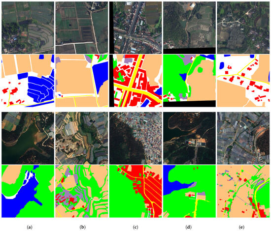 Diverse geographical landscape on the LoveDA dataset and the Dalat dataset. Diversity examples are in (a) “Water”; (b) “Barren”; (c) “Building” and “Road”; (d) “Forest”; and (e)“Agricultural”. The first row contains images from the LoveDA dataset; the second row contains labels of images from the LoveDA dataset; the third row contains images from the Dalat dataset; the fourth row contains labels of images from the Dalat dataset.
