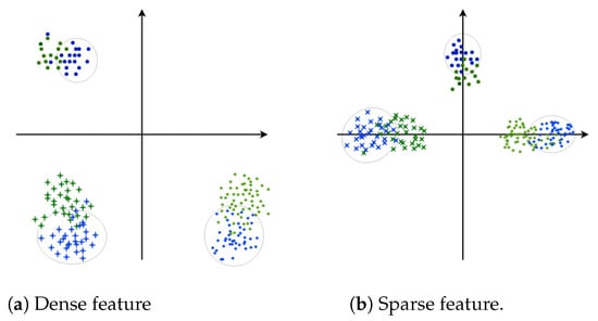 An intuition between conventional and sparse features under the domain gap issue. Blue color means features on the source domain; green color means features on the target domain (unseen domain). The circle is the classifier trained on the source domain.