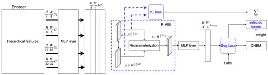Figure 4 presents an overview of the proposed method. The network is based on the SegFormer architecture [5]. It uses the Mix Transformer (MiT) [36] backbone to extract hierarchical characteristics, which are subsequently resized and fused via an MLP layer. The VIB module then calculates the mean and variance of these features, allowing new features to be sampled from these distributions. A KL divergence loss [37] is applied to select sparse and informative features for the classification head. In addition, the OHEM that learns from hard samples helps the model to convert faster. The remainder of this section provides further details: Section 3.1 describes the network architecture, Section 3.2 explains the loss function, and Section 3.3 discusses the OHEM strategies for the training process.
