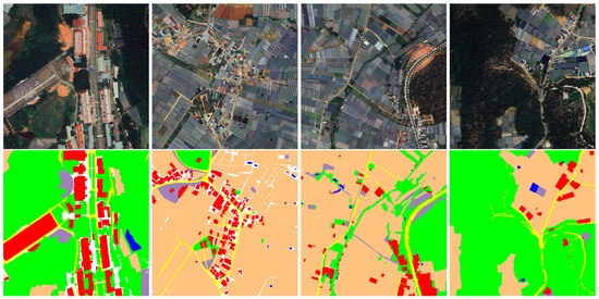 To evaluate the performance of the model in a real-world setting, we collected and labeled a new dataset in District 12 of Dalat City. Some examples of the dataset are shown in Figure 6. To reduce the domain gap issue, we strictly follow the setting in the LoveDA dataset to collect and label data. The resolution for each pixel is 0.3 m; and images are labeled with classes corresponding to those outlined by the LoveDA dataset: building, road, water, barren, forest, agriculture, and background. In total, 64 high-resolution (1926 × 1825 pixels) images capture various types of land cover within the city of Dalat. We may see that there is a geometry difference between LoveDA and Dalat City, as discussed in Figure 1 in Section 1.