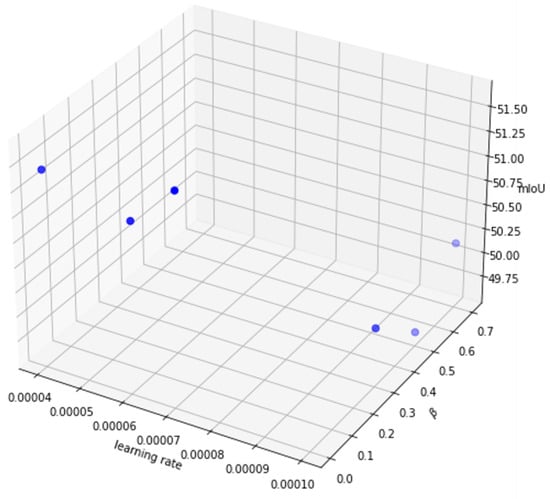 Based on these findings, we conclude that the default setting of SegFormer [5] is optimal for training; an increase in tends to reduce mIoU, but a reduction on does not improve mIoU too much. Additionally, the hyperparameter should be smaller than 0.1; higher values do not produce better mIoU outcomes.