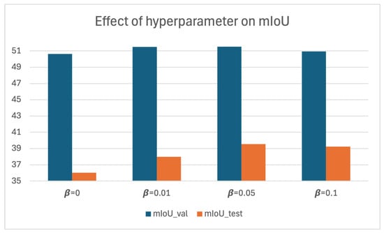 In Figure 8, represents the baseline SegFormer; other settings mean that the VIB module is applied with a corresponding parameter . The setting improves performance in both the validation and the testing datasets. This result indicates that the VIB module helps with unseen data in the same domain (the validation dataset). In addition, it also helps with data from unseen domains (the testing dataset). Performance improves further with , suggesting that VIB effectively strengthens the generalization of the model. However, increasing to slightly reduces performance compared to , probably due to being over-sparse, which limits the features necessary for robust representation. Thus, increasing beyond a certain threshold can affect the ability to extract sufficient information for accurate feature selection.