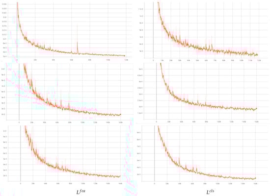 In Figure 4, the model is trained using a classification loss and a feature-selection loss. Let i denote the pixel in an image, with and representing the ground truth label and the predicted label for that pixel, respectively. The classification loss is formulated as a standard classification loss, as shown in Equation (4). Furthermore, the feature-selection loss is based on the Kullback–Leibler (KL) divergence, enforcing the learned feature distribution to approximate a predefined distribution . Typically, is chosen as a standard normal distribution, . Based on , the feature-selection loss is defined by Equation (5).