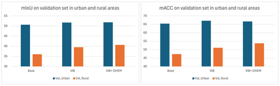 In addition to the learning rate, is a critical hyperparameter that must be carefully optimized. A lower value of implies minimal selection of features, while a higher value of may lead to excessive reduction of features, potentially resulting in insufficient information to handle challenging samples effectively. Figure 8 illustrates the mIoU in both the validation and testing datasets. In particular, the validation dataset consists of urban area images, while the testing dataset comprises rural area images, leading to a notable drop in testing performance relative to the validation set.