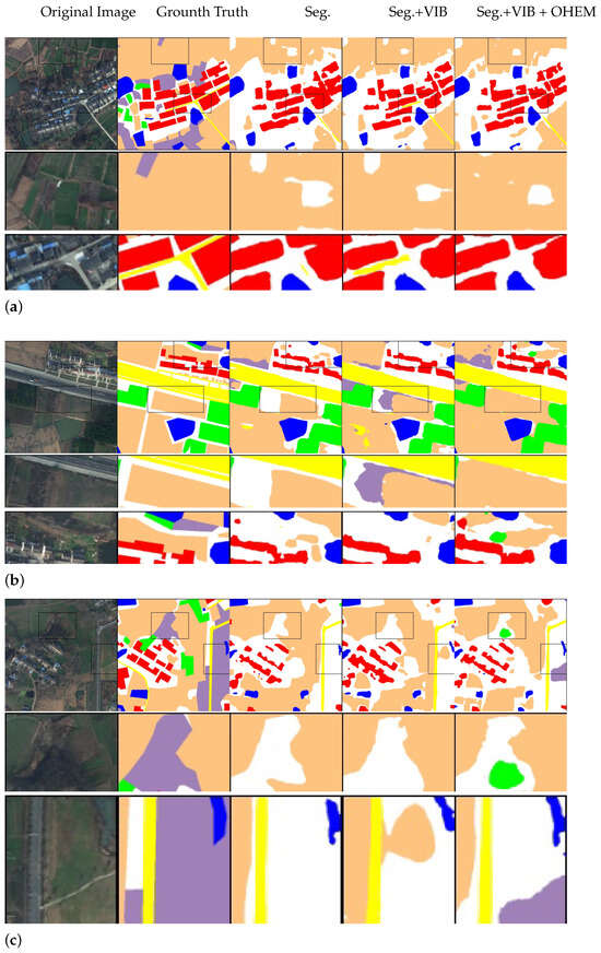 The P-VIB introduces uncertainty during training through random sampling, which makes the model take more time to converge. To address these issues, we employ an Online Hard Example Mining (OHEM) [16] strategy to prioritize hard samples throughout training. Using OHEM, the model focuses on challenging examples (those it finds more difficult to classify or segment) rather than treating all samples equally. This approach accelerates training by helping the model learn from mistakes and improves its capacity to handle complex cases. In satellite image segmentation, hard samples often represent rare features, so focusing on these cases avoids overfitting and enables the model to achieve optimal performance more quickly. When OHEM is accompanied by P-VIB, it helps the model to converge faster even if the VIB-based training is complex.