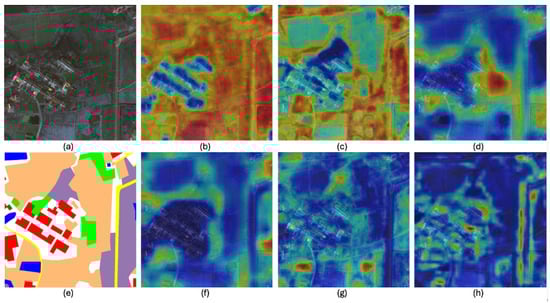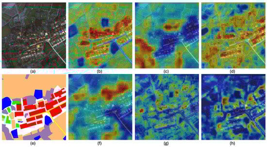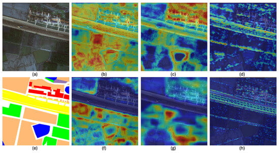 Figure 15 presents another example of feature maps, where our method effectively meets the C2 criterion because similar pixels exhibit consistent responses. For instance, Figure 15b strongly highlights the “Agricultural”, “Barren”, “Forest’, and “Road” classes while suppressing the “Building” class. Figure 15c shows consistent activation for the “Barren” and “Agricultural” classes, while Figure 15d partially detects the “Forest” class but misses some areas, leading to segmentation errors. In contrast, the traditional SegFormer continues to exhibit fragmented feature maps, causing many regions to be misclassified as background, further reinforcing the advantage of our approach in maintaining spatial consistency.