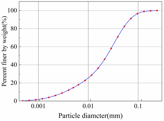 To reduce human interference and achieve the desired experiment results, the test soil samples were collected from a construction site pit in the South Lake area of Wuhan. The samples were undisturbed and contained few impurities, with a plastic limit of 23.0%, a liquid limit of 41.0%, and a natural density of 1.50 g/cm3. The soil’s optimum moisture content was 20.0%, and the natural moisture content was approximately 15.3%. Particle size analysis was conducted using a laser particle size analyzer, and the particle size distribution curve of the soil sample is shown in (Figure 2), indicating good gradation.