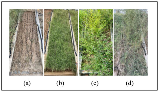 Slopes of different plant species. (a) Bare slope; (b) Bermudagrass slope; (c) Magnolia slope; (d) grass–shrub slope.