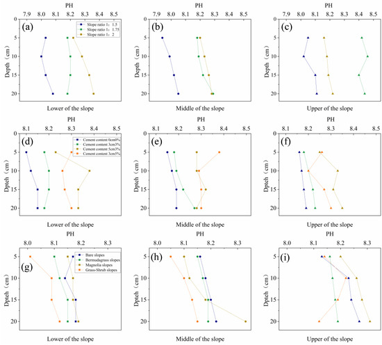 Variation characteristics of soil pH on slopes with different gradients, vegetation types, and cement content base materials. (a) Soil pH at lower of the slope positions under different slope gradients; (b) soil pH at middle of the slope positions under different slope gradients; (c) soil pH at upper of the slope positions under different slope gradients; (d) soil pH at lower of the slope positions under different cement contents in base materials; (e) soil pH at middle of the slope positions under different cement contents in base materials; (f) soil pH at upper of the slope positions under different cement contents in base materials; (g) soil pH at lower of the slope positions under different vegetation types on slopes; (h) soil pH at middle of the slope positions under different vegetation types on slopes; (i) soil pH at upper of the slope positions under different vegetation types on slopes.