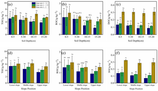 The TOC, ROC, and DOC of Bermudagrass slope with different slopes and 3 cm 3% cement content changes with depth and slope position. Uppercase letters are assigned to denote statistically significant variations (p < 0.05) between soil layers or topographic positions. Lowercase letters distinguish significant differences (p < 0.05) across varying slope gradients. (a) Vertical distribution of TOC content of different slope gradients. (b) Vertical distribution of ROC content of different slope gradients. (c) Vertical distribution of DOC content of different slope gradients. (d) Spatial variation of TOC across slope positions under varying gradient conditions. (e) Spatial variation of ROC across slope positions under varying gradient conditions. (f) Spatial variation of DOC across slope positions under varying gradient conditions.
