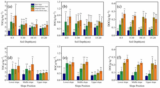 Different vegetation types with 0 cm 0% cement content and a slope ratio of 1:1.75 for TOC, ROC, and DOC with depth and slope position changes. Uppercase letters denote significant variations (p < 0.05) between soil horizons or slope positions. Lowercase letters represent statistically distinct values (p < 0.05) across vegetation communities. (a) Vertical distribution of TOC content of different vegetation types. (b) Vertical distribution of ROC content of different vegetation types. (c) Vertical distribution of DOC content of different vegetation types. (d) Spatial variation of TOC along slope positions across vegetation types. (e) Spatial variation of ROC along slope positions across vegetation types. (f) Spatial variation of DOC along slope positions across vegetation types.