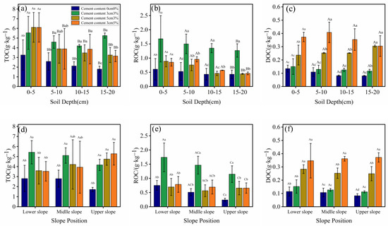Different cement content slope ratios of 1:1.75 Bermudagrass slope to TOC, ROC, and DOC with depth and slope position changes. Uppercase letters denote statistically distinct values (p < 0.05) between soil horizons or topographic positions. Lowercase letters signify significant variations (p < 0.05) in cement content levels. (a) Vertical distribution of TOC content of different cement contents. (b) Vertical distribution of ROC content of different cement contents. (c) Vertical distribution of DOC content of different cement contents. (d) Spatial variation of TOC across slope positions with varying cement content levels. (e) Spatial variation of ROC across slope positions with varying cement content levels. (f) Spatial variation of DOC across slope positions with varying cement content levels.