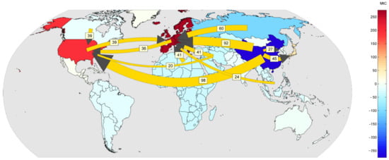 Peters et al. developed a detailed model to calculate consumer-based carbon emissions and analyzed the carbon emissions of embedded products in major regions [10]. Based on intuition, China established itself as the largest product provider in 2011. The net CO2 export from China was 1.077 GT vs. a total emission of 9.78 GT (making the net export 11%). In 2011, 128 million tons of CO2 were exported from China to the rest of the world, especially to the United States and members of the European Union. As shown in Figure 2, China was a great exporter of embedded CO2 on a large scale, ahead of the EU, the USA, and Oceania countries. The top 12 inter-regional flows of fossil fuel carbon embodied in trade from extracting region to producing region are broken down by primary fuel type and disaggregated further to highlight key countries.