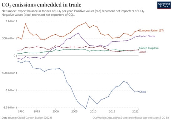 - CO2 Emissions Embedded in Trade. Available online: https://ourworldindata.org/grapher/co-emissions-embedded-in-global-trade?tab=chart&time=2002..latest&country=USA~GBR~CHN~OWID_EU27~JPN (accessed on 11 December 2024).